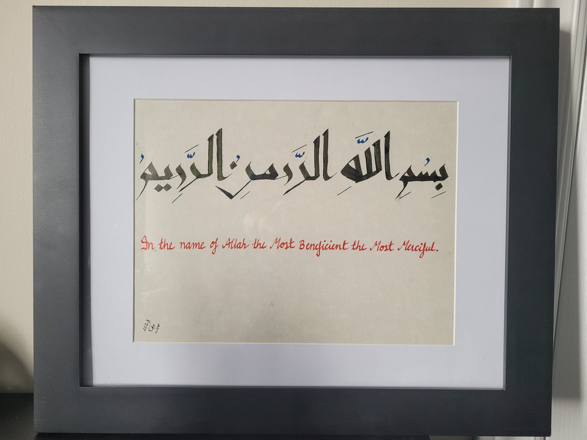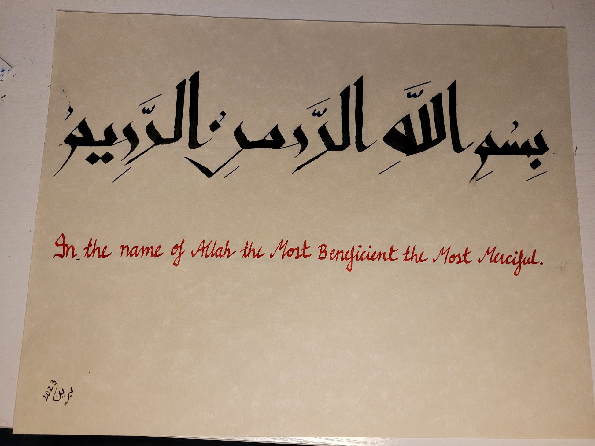 After hours of practice and re-practice from markers to qalams to calligraphy pens to sketch pads, paper and finally to calligraphy paper, the deeper meaning of these words started to unveil for me. "I start with the name of Allah" - yes of course - "who is the Most Beneficent, the Most Merciful". Makes sense to call upon Allah's Mercy and Beneficence in our big endeavors, like a new project at work, an exam, driving a car for the first time, going down a big ski hill. But why has it been prescribed to say this phrase for the small daily tasks too, like enter into our homes, eat a meal, read the Quran etc. Because somewhere along the way our humanness kicks in and even with our small daily tasks slip ups and blunders happen. It is a reminder to us to be kind to ourselves when we make random blunders.