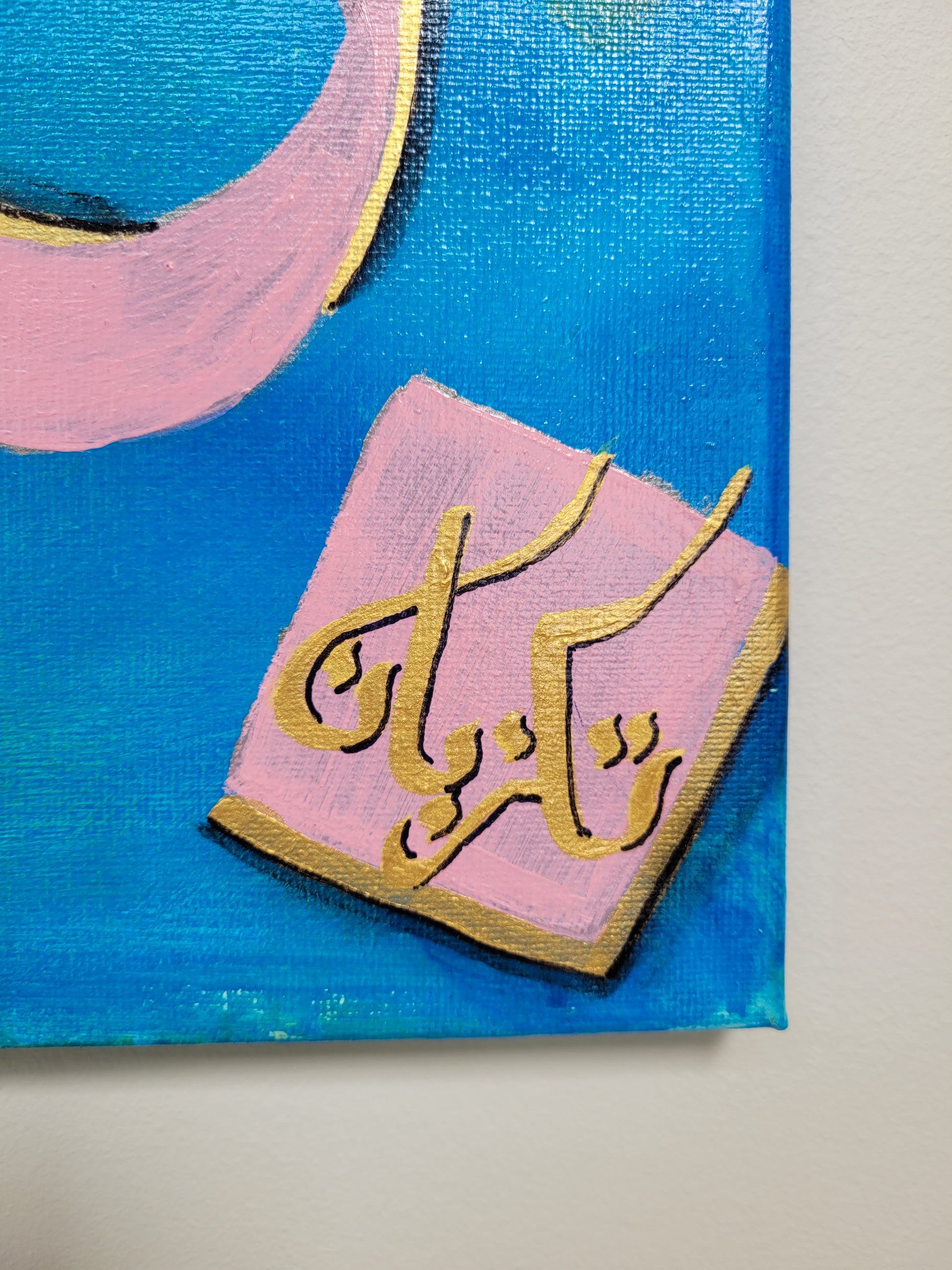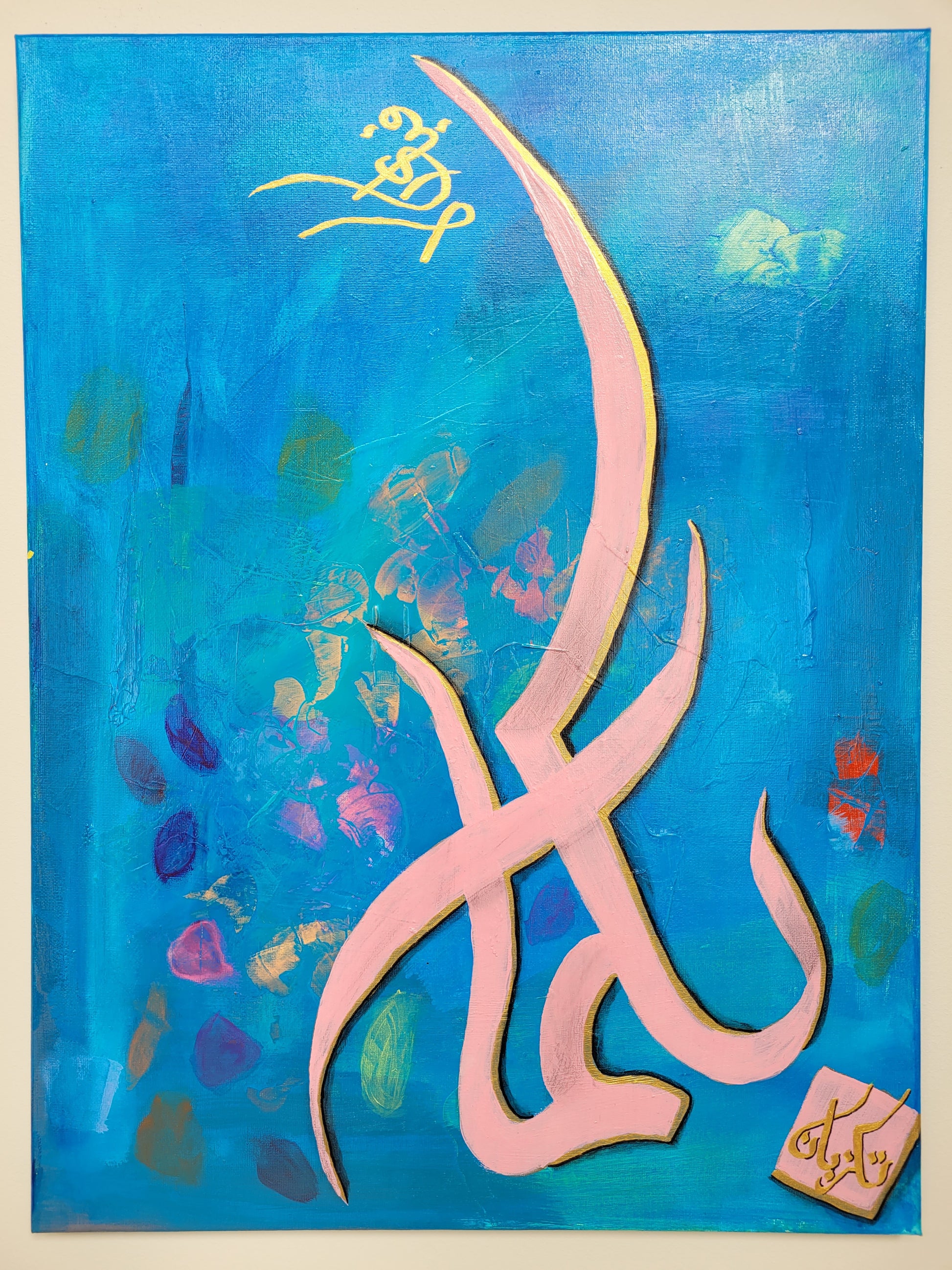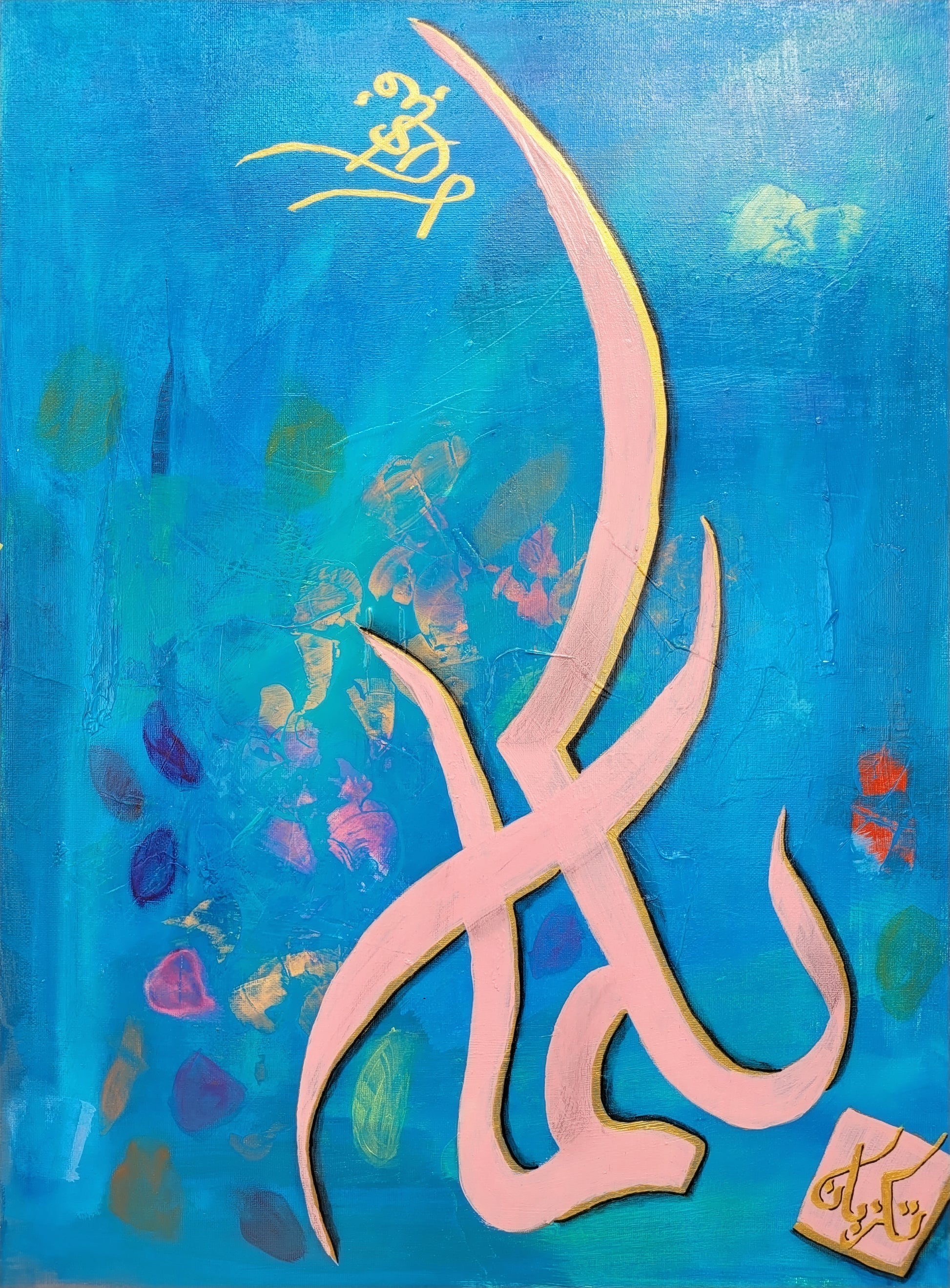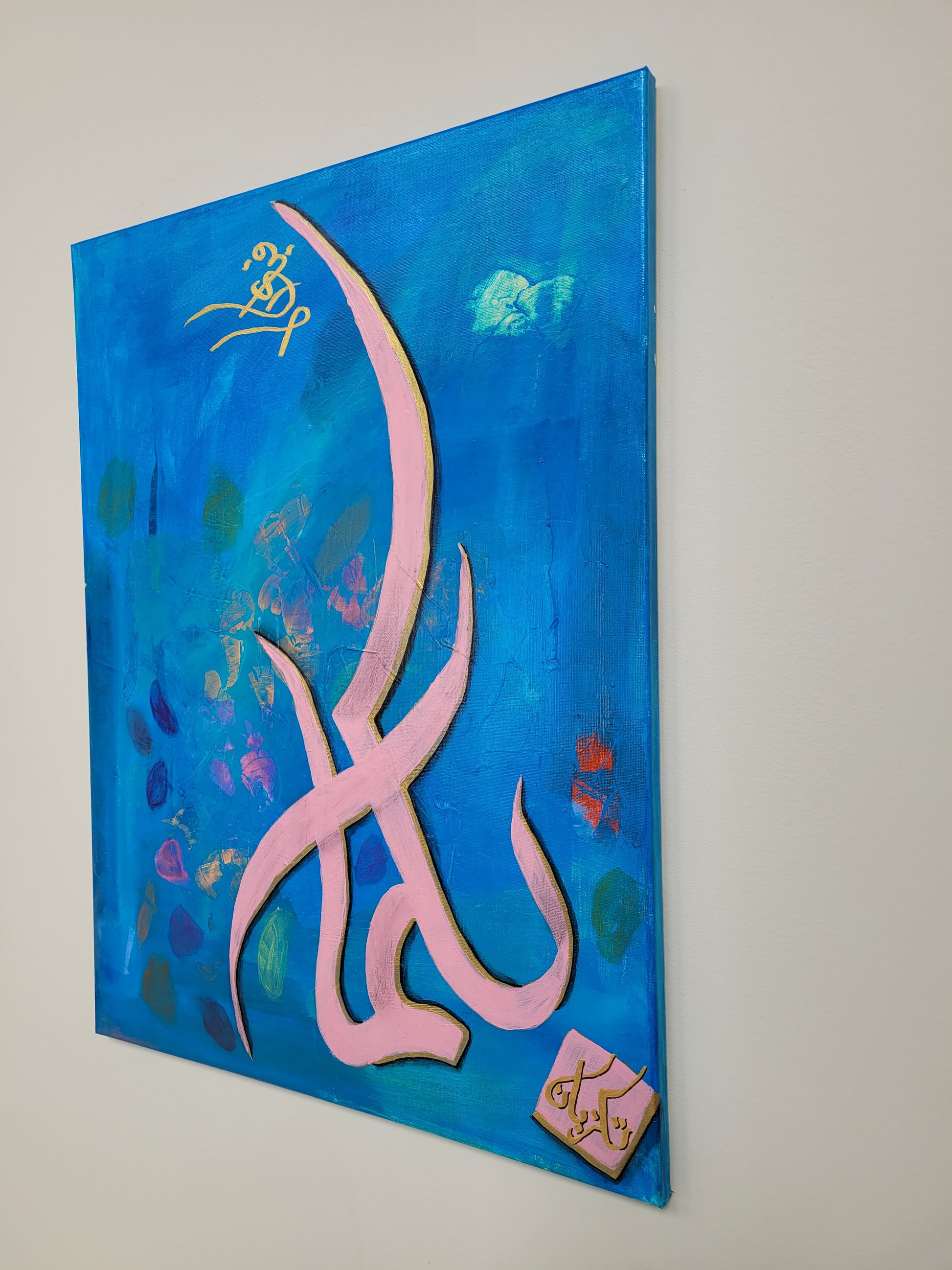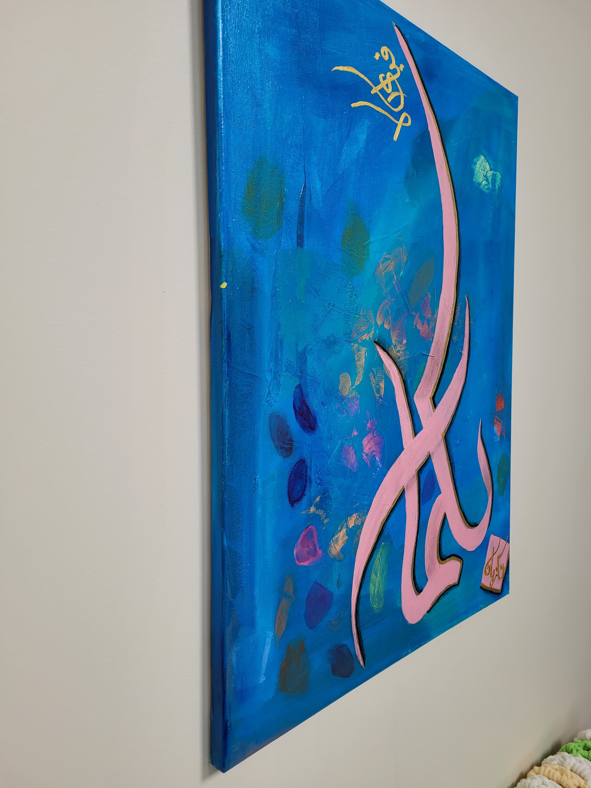 This beautiful piece with leave you mesmerized in its uniqueness. It is composed in a modern script with mysteriously hidden words that leave the viewer searching for the ultimate question that Allah asks and answers in the beautiful Surah AR-Rahman.
