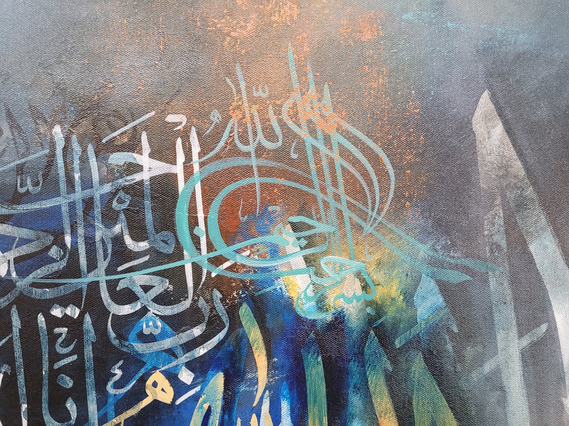 About the Artist: Mohsin Raza is an award winning artist, who won the 2019 award for Calligraphic art from the President of Pakistan. He has been working with Islamic calligraphic art for over 15 years. He is pushing boundaries with his calligraphic work by incorporating multiple colors and mediums into his pieces. His play on soothing color palettes transports the viewer into a dimension of peace and tranquility. He is based out of Faisalabad, Pakistan and travels throughout Pakistan and the Middle East for his art exhibitions.